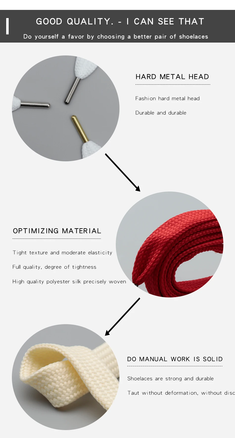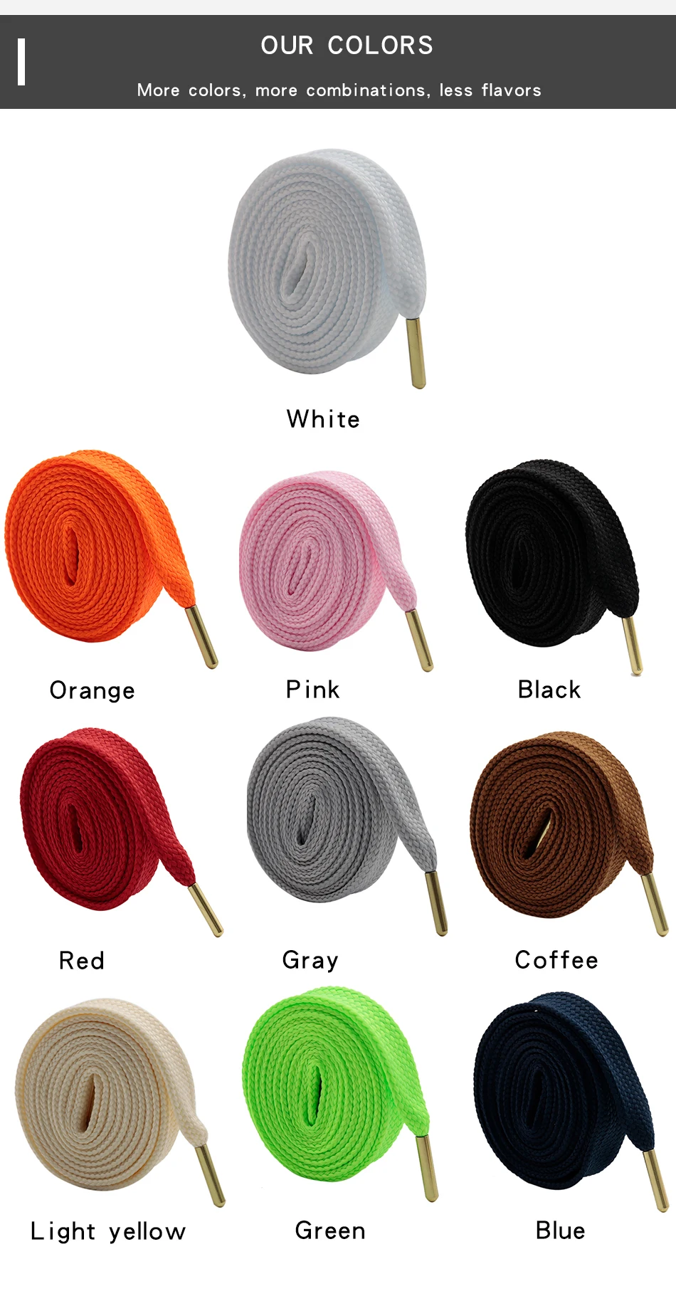 | -Customized for Yourself/Logo/Bulk Order ·We also could accept customised length and color according to your request as sample order,Please contact us for help. ·Support Printing Logo on the Plastic or Metal Aglets. ·If you want to make bulk order more than 50 pairs,Please contact us for a better price. |