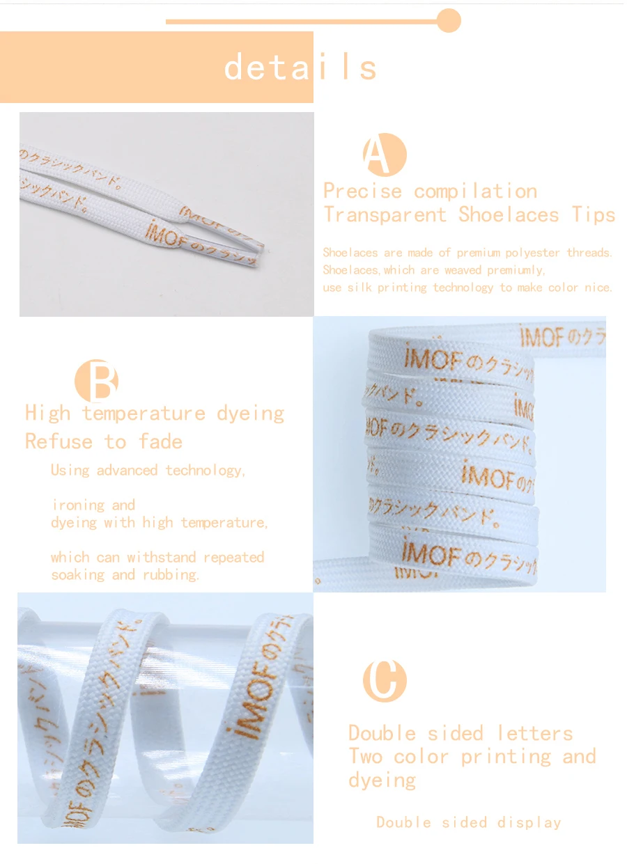 2.Color: white and gold text; 3.Material: Polyester + Plastic tips; 4.Logo: Support Printing Logo on the Plastic or Metal Aglets;